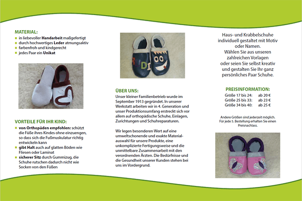 Wir fertigen individuell gestaltete Haus- und Krabbelschuhe für Kinder und Erwachsene an - aus Leder, mit Motiv oder Namen. Wählen Sie aus unseren zahlreichen Vorlagen oder seien Sie selbst kreativ und gestalten Sie Ihr ganz persönliches Paar Schuhe.